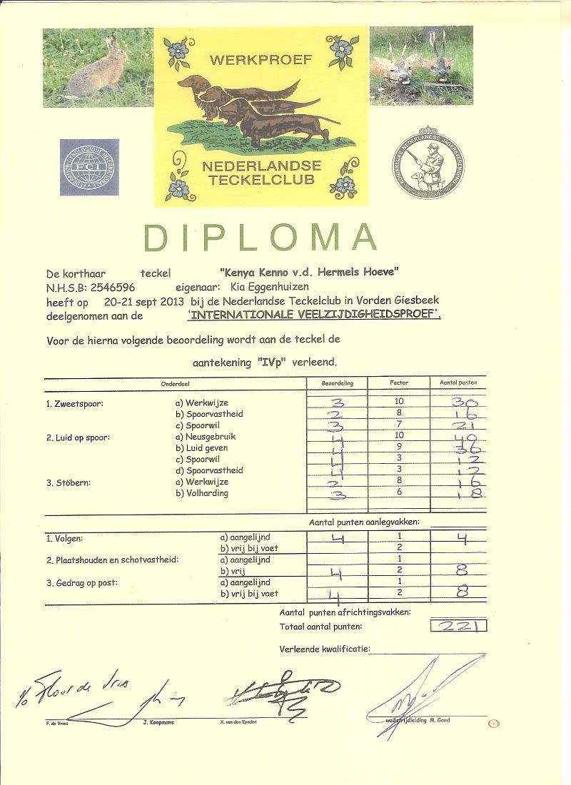 | volledige naam | Nederlands, Luxemburgs, Duits/VDH, Belgisch, Internationaal Schoonheids & Internationaal Show Kampioen Kenya Kenno v.d. Hermels Hoeve, Nederlands Jeugd Kampioen, Nederlands Veteranen Kampioen, WUT J-Ch, WUT Ch, WUT Vet.Ch, Belg. Junior Winster 2006, Brussels Winster 2007, Belg. Winster 2008, Belg. Veteranen Kampioen, Luxemburgs Veteranen Kampioen, Benelux veteranen Kampioen, WUT- Welt VeteranenSieger 2015, Sv, WaT, Sp, BhFK95, St, SchwhK, Vp, IntVp, SchwhK/40, SchwhKF, SchwhKF/40 . |